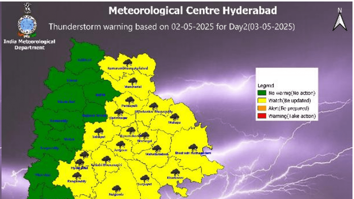 In dia Meteorological Department issued thunderstorm alert to 20 districts of Telangana for Saturday (May 3, 2025)
